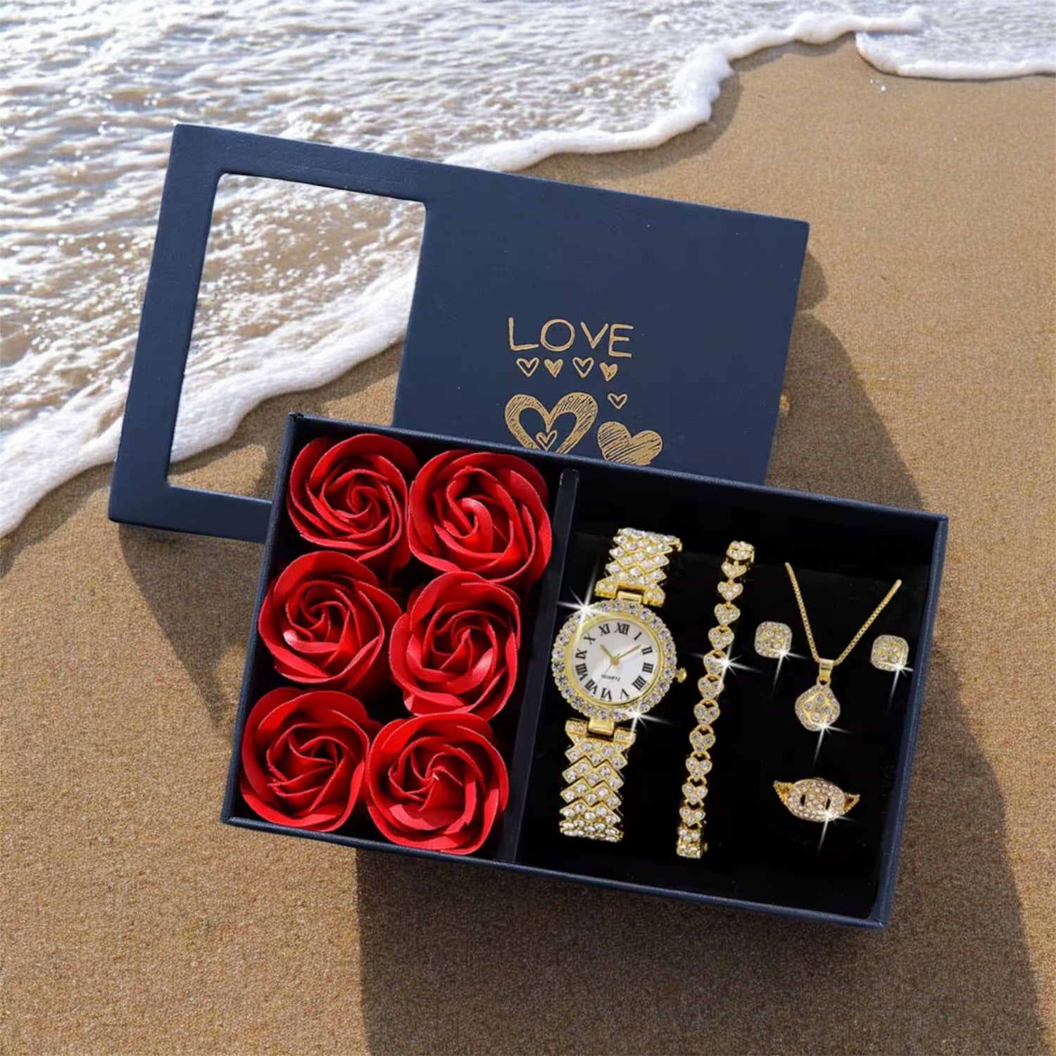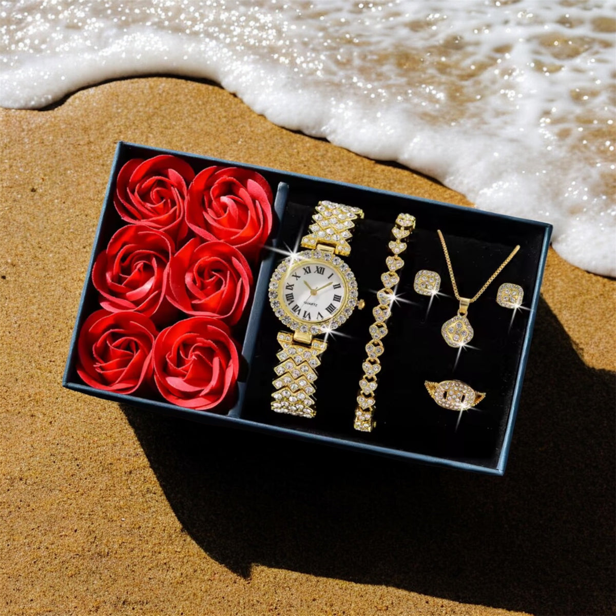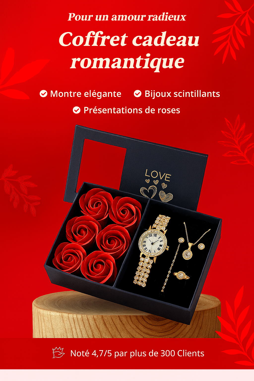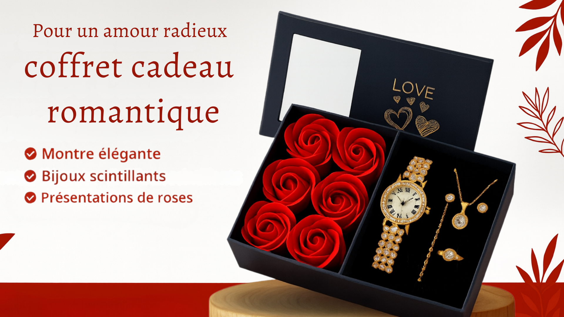 Offrez un cadeau élégant et romantique. Chaque coffret contient une montre étincelante, un ensemble de bijoux assortis et six roses soigneusement présentées.